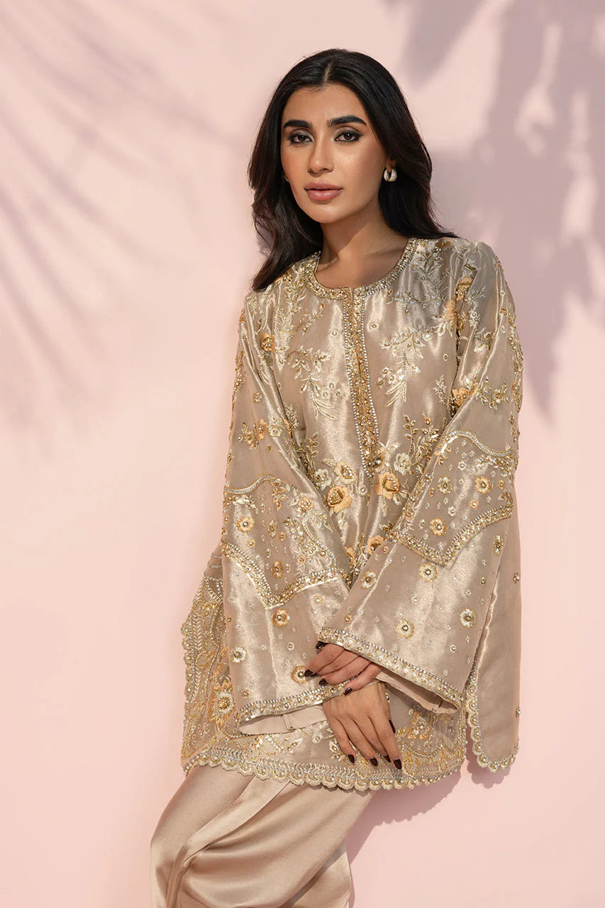This luminous champagne gold ensemble features a short tissue shirt fully enveloped in tonal zardoze embroidery, forming an ornate tapestry of floral and vine motifs. The richly worked top is paired with matching charmeuse shalwar in a fluid tulip-inspired drape, creating a cohesive and softly sculpted silhouette.
