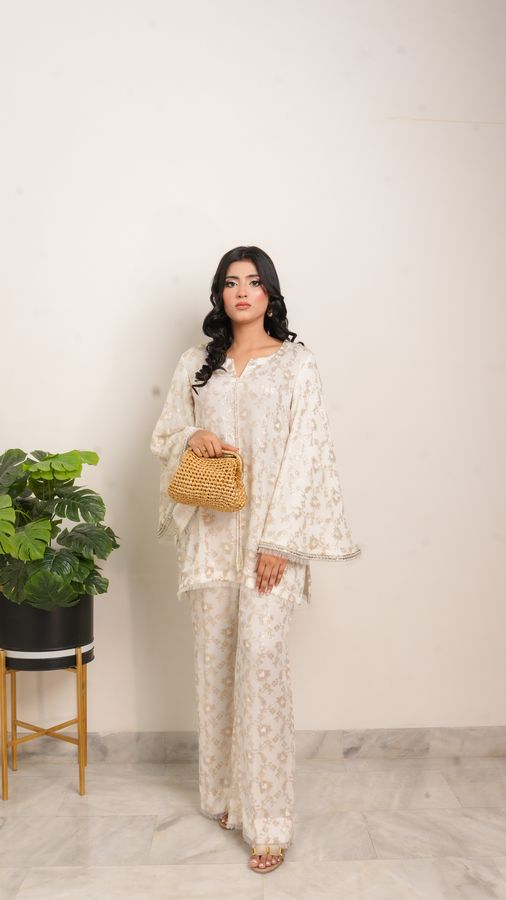 embroidered luxury co-ord set, designed for the modern woman who values comfort without compromising style. This chic two-piece ensemble features delicate embroidery on premium fabric, paired with wide-leg trousers for a graceful silhouette. The relaxed fit and intricate details make it the perfect choice for formal gatherings, festive events, or elevated everyday wear.