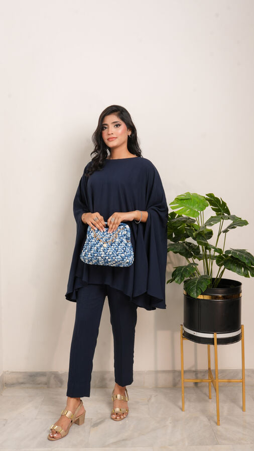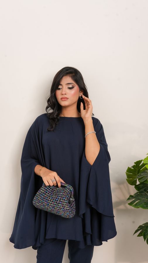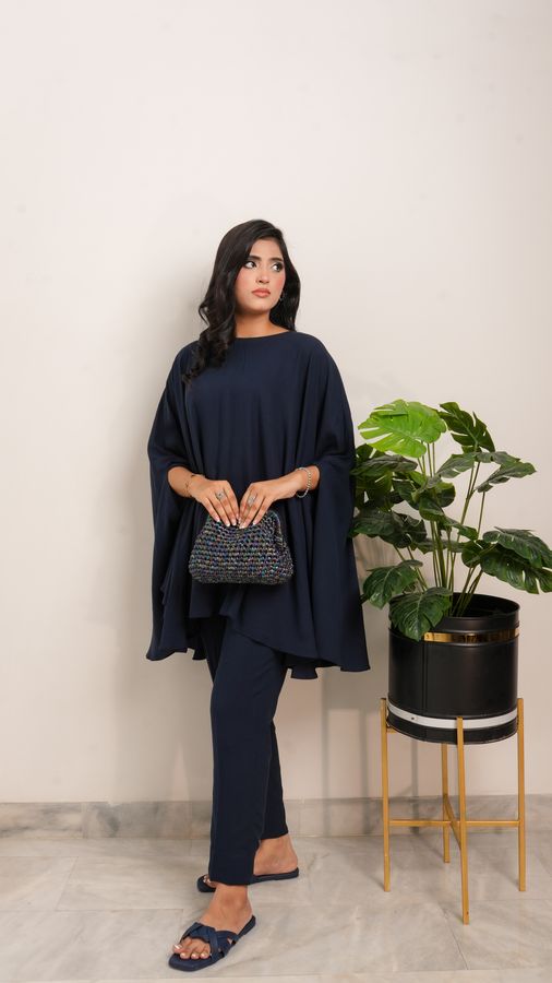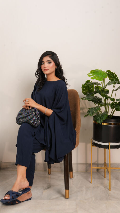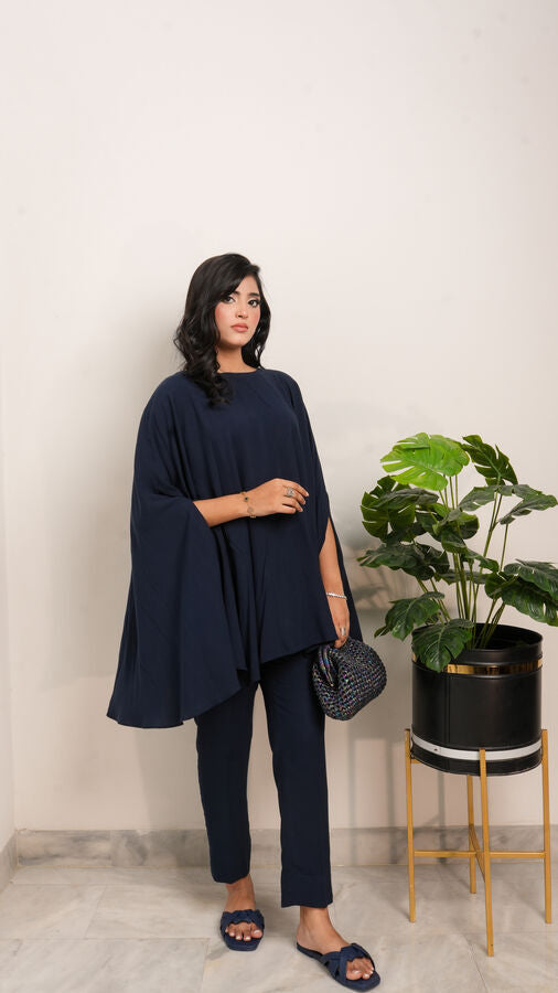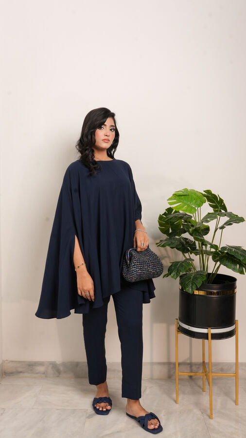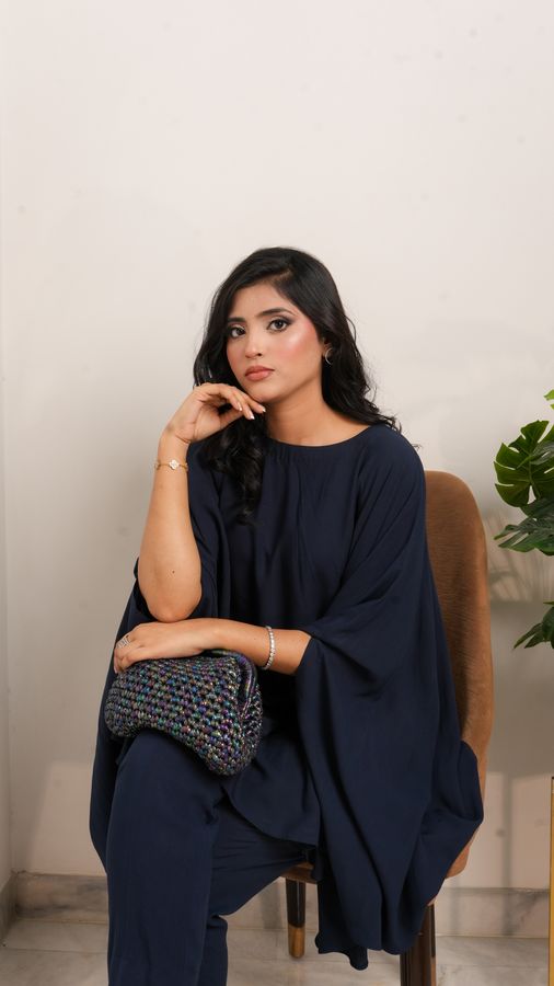 Navy blue cord set featuring a loose-fitting top with layered hem and matching slim-fit pants, perfect for a chic and comfortable look.