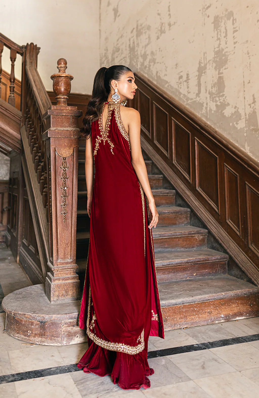 Extracted from deep scarlet velvet for winter festivities, the Ruhi set resonates with modern-day women with their traditions. Our artisans have delicately incorporated mixed embellishments for bunches at the front, and along the collar and neckline that elaborate till the sides and damaan of the kameez. Ruhi is the perfect burst of contemporary and chic festive outfit that you can style on bridal showers and even for a sleek reception look.